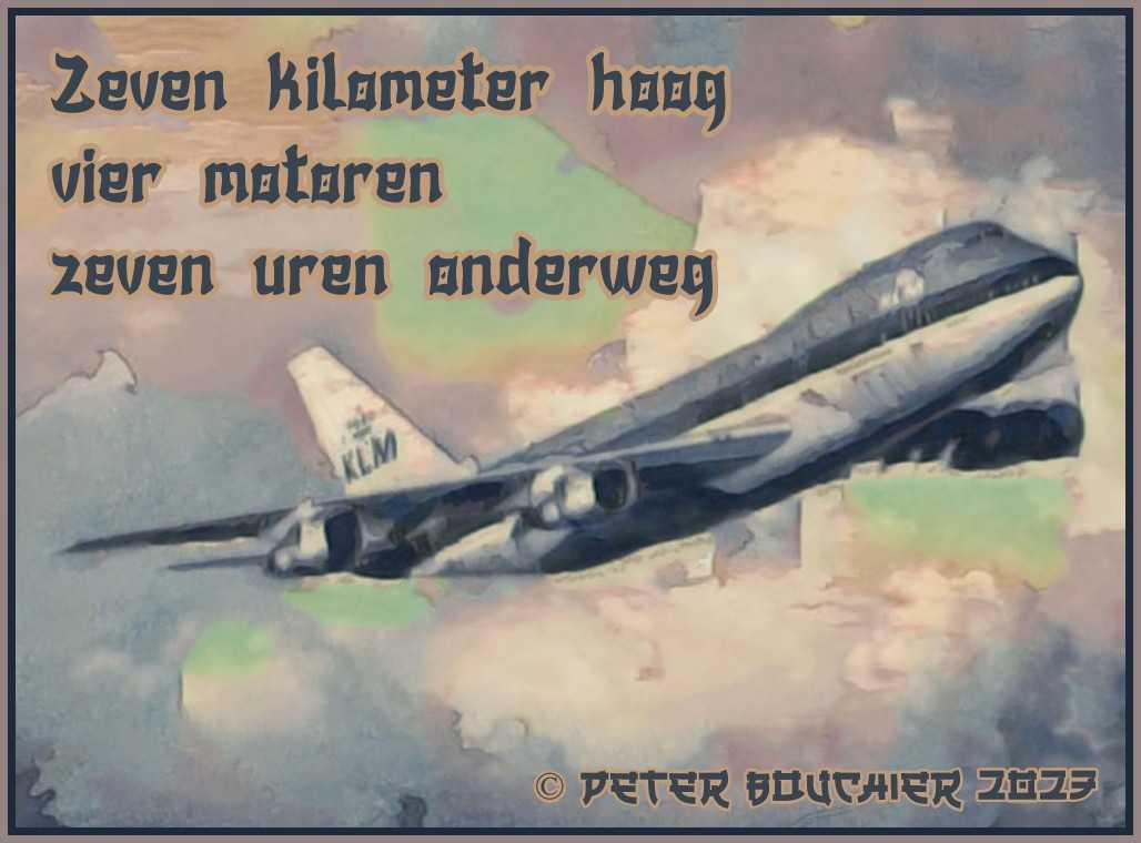De haiku is een traditionele Japanse dichtvorm die nogal afwijkt van die uit het westen. Een haiku bevat geen rijmklanken, en wordt strikt ingedeeld in achtereenvolgens 5, 7 en 5 lettergrepen. In deze pseudo-haiku’s is dat schema enigszins aangepast. Dit nieuwe schema van 7, 4 en 7 lettergrepen wordt een Bo-ing genoemd, naar het vliegtuig op onderstaande afbeelding © Vin Konings