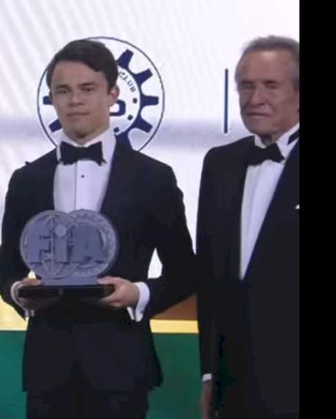 Nyck de Vries krijgt zijn fia award. Nog steeds trots dat hij tijd nam voor een interview met mij en leerlingen.